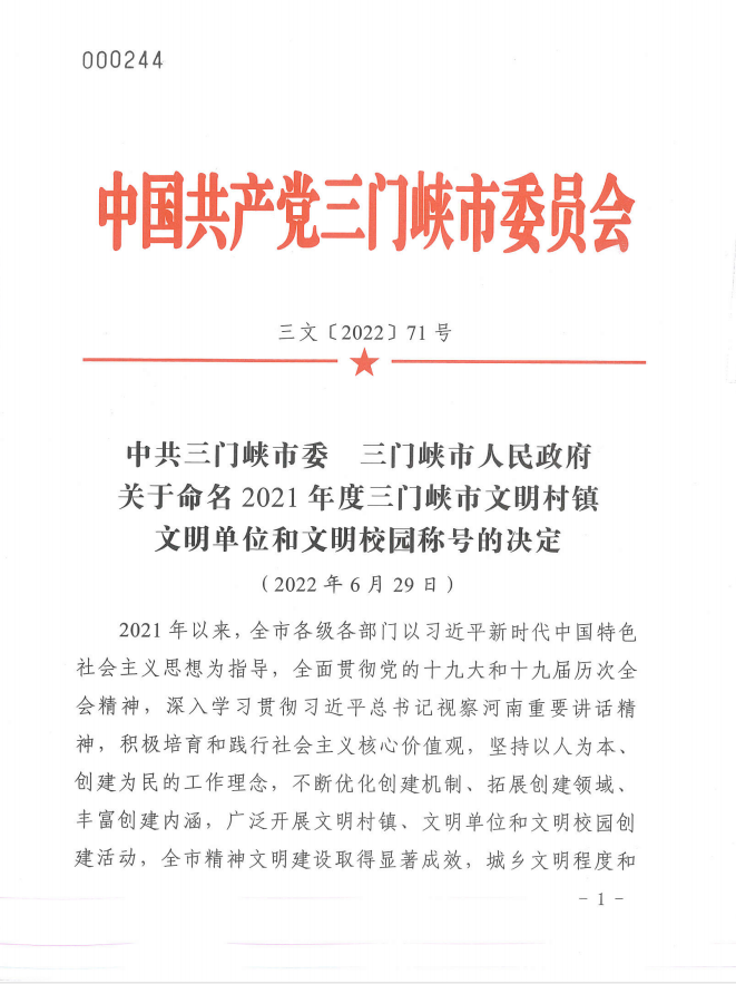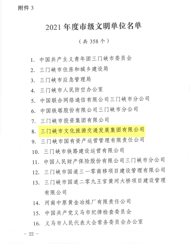近日,三門峽市委、市政府印發(fā)《關于命名2021年度三門峽市文明村鎮(zhèn)、文明單位和文明校園稱號的決定》(三文〔2022〕71號),市文旅集團榮獲“2021年度市級文明單位”稱號。